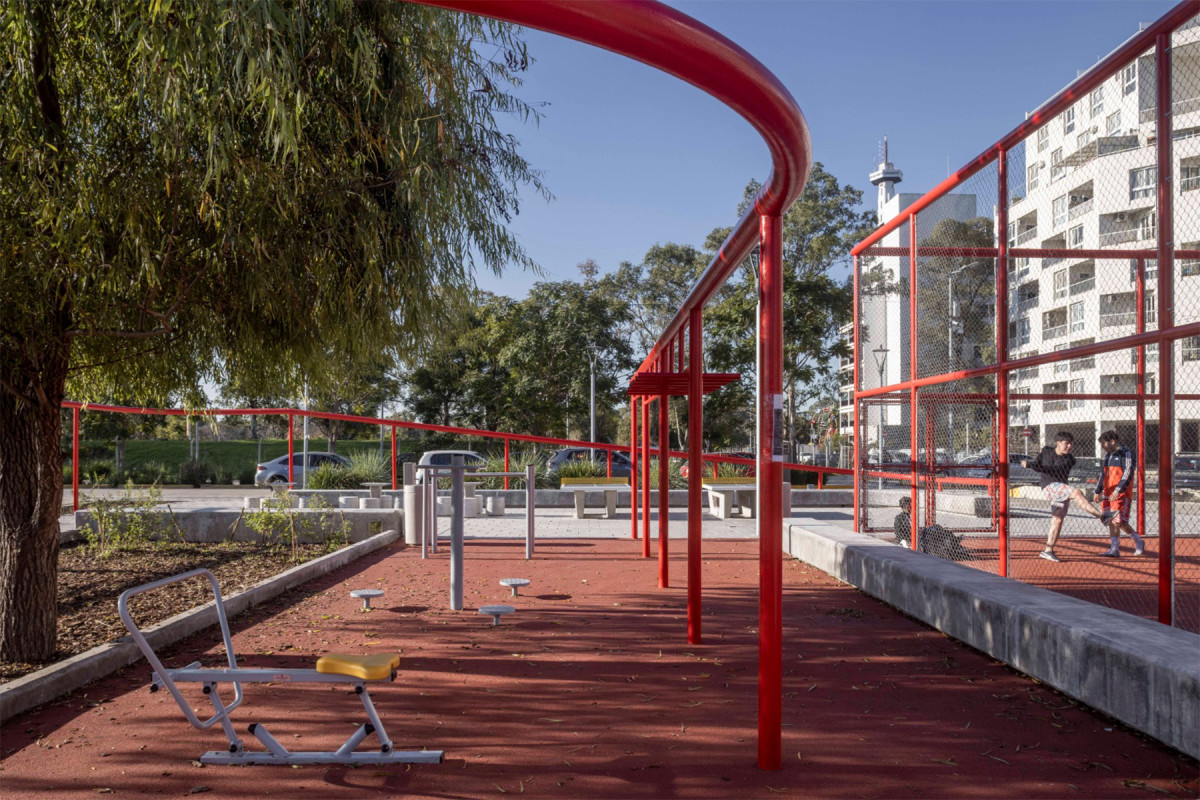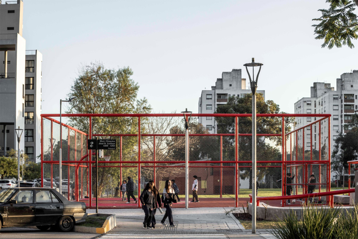 The design was based on universal accessibility criteria to create an inclusive and safe environment with distinct zones for playing, resting, and exercising. The organizing element is a distinctive red metal tube structure that provides a strong visual identity and simultaneously serves as support for play equipment, urban furniture, and signage. Its layout defines the pathways and organizes the program, which includes a basketball court, an exercise area, and a children's playground.